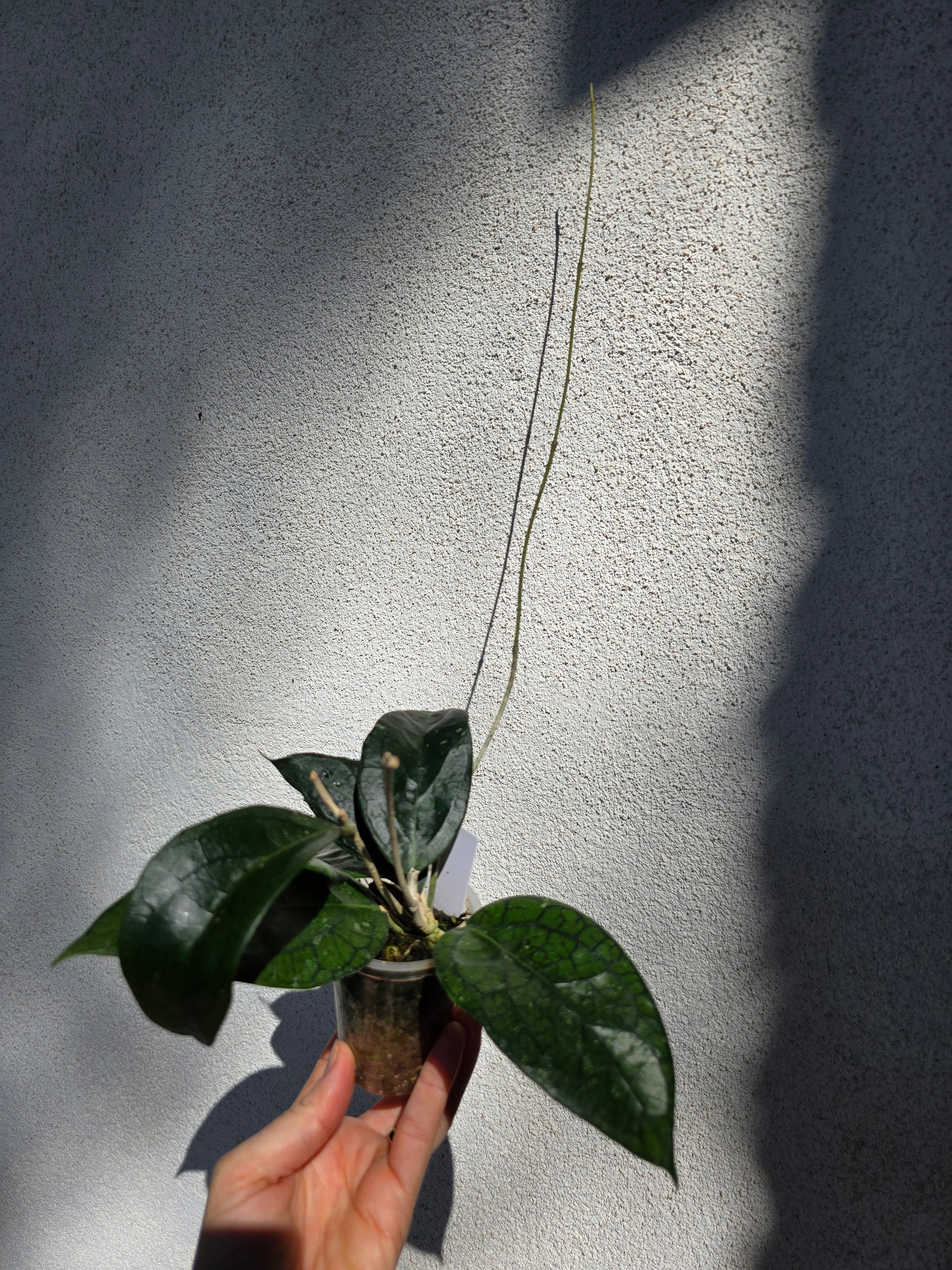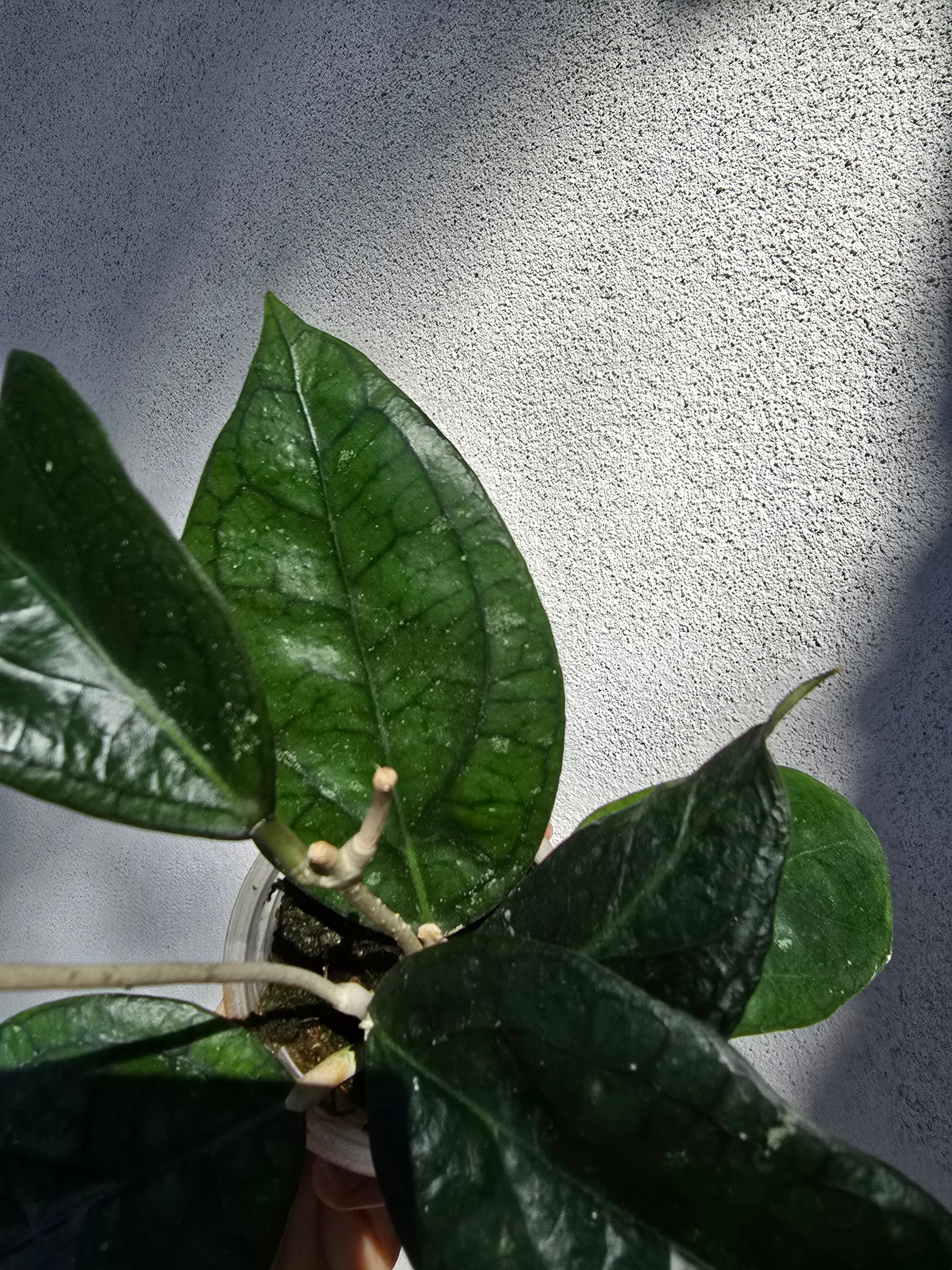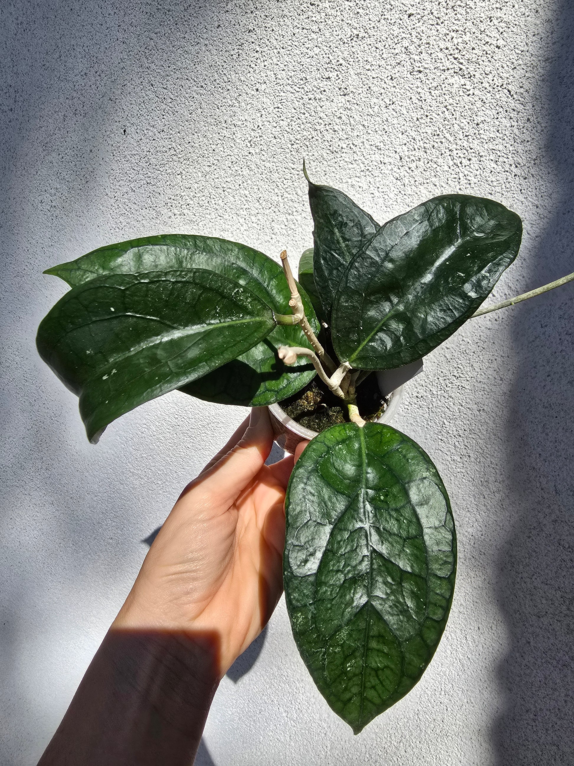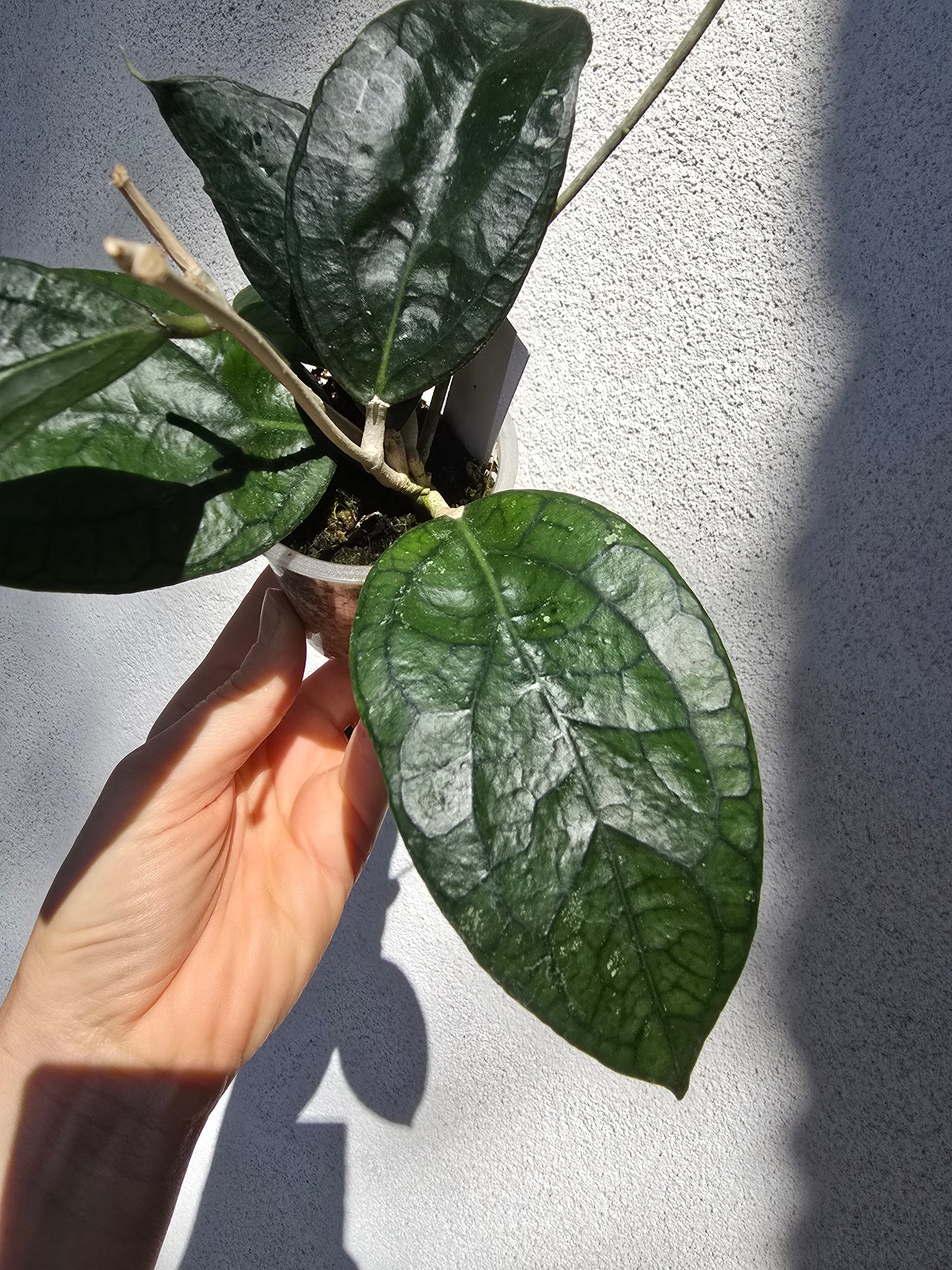 Magnifique hoya hybride assez rare, aux feuilles épaisses et veinées, de couleur foncée mais qui rougissent si tu leur donnes une bonne exposition (sunstress)